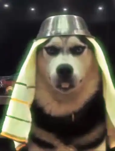 Husky Dog with Bowl and Towel on Head